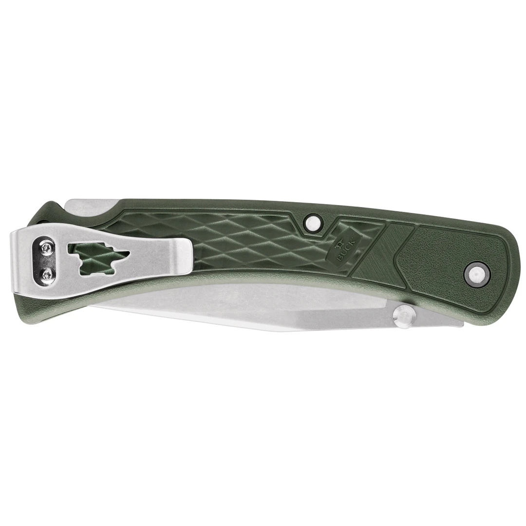 This folder model features olive drab green GFN handles, a clip point style blade in a stonewash finish and the reversible pocket clip is designed for tip up carry only.