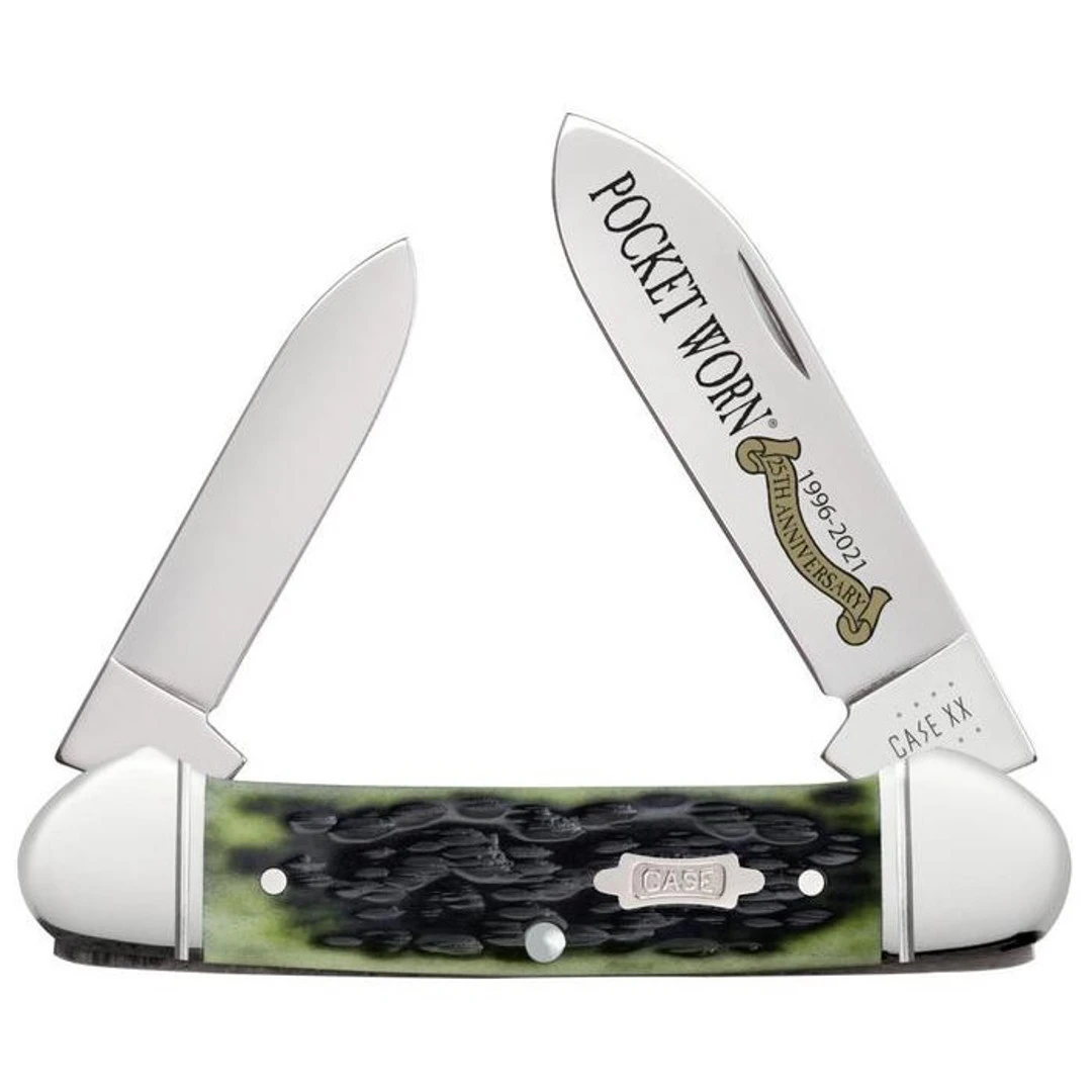 Case Pocket Worn Olive Green Bone Peach Seed Jig Canoe Knife boasts two knives that will provide a variety of cutting abilities. The spear knife features a symmetrical blade shape with a point that provides peak piercing performance. The pen knife is great for light-duty chores around the house. These two blades, paired with the beautiful olive green bone of the handle make this knife a wonderful addition to your everyday carry.