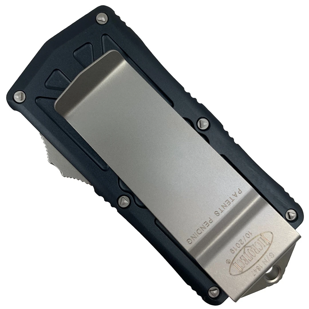 This out-the-front knife features a black anodized handle and a dagger style blade in a stonewash finish.
