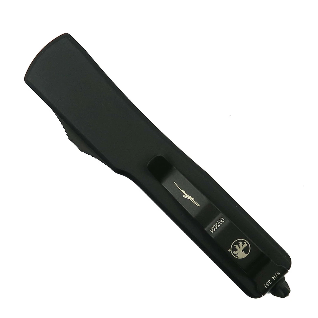 A Signature Series model, this Microtech UTX-70 features a natural Jade green G10 upper handle scale for a truly unique look and feel. The lower handle is anodized black aluminum. Boasting extremely sophisticated internal mechanisms, this knife opens and closes reliably and smooth with the slide trigger. The dual edge blade has a black finish with satin highlights. Like each of the special Signature Series models, the pocket clip has the Marfione signature, the “birth date” of the knife, and the S/N.