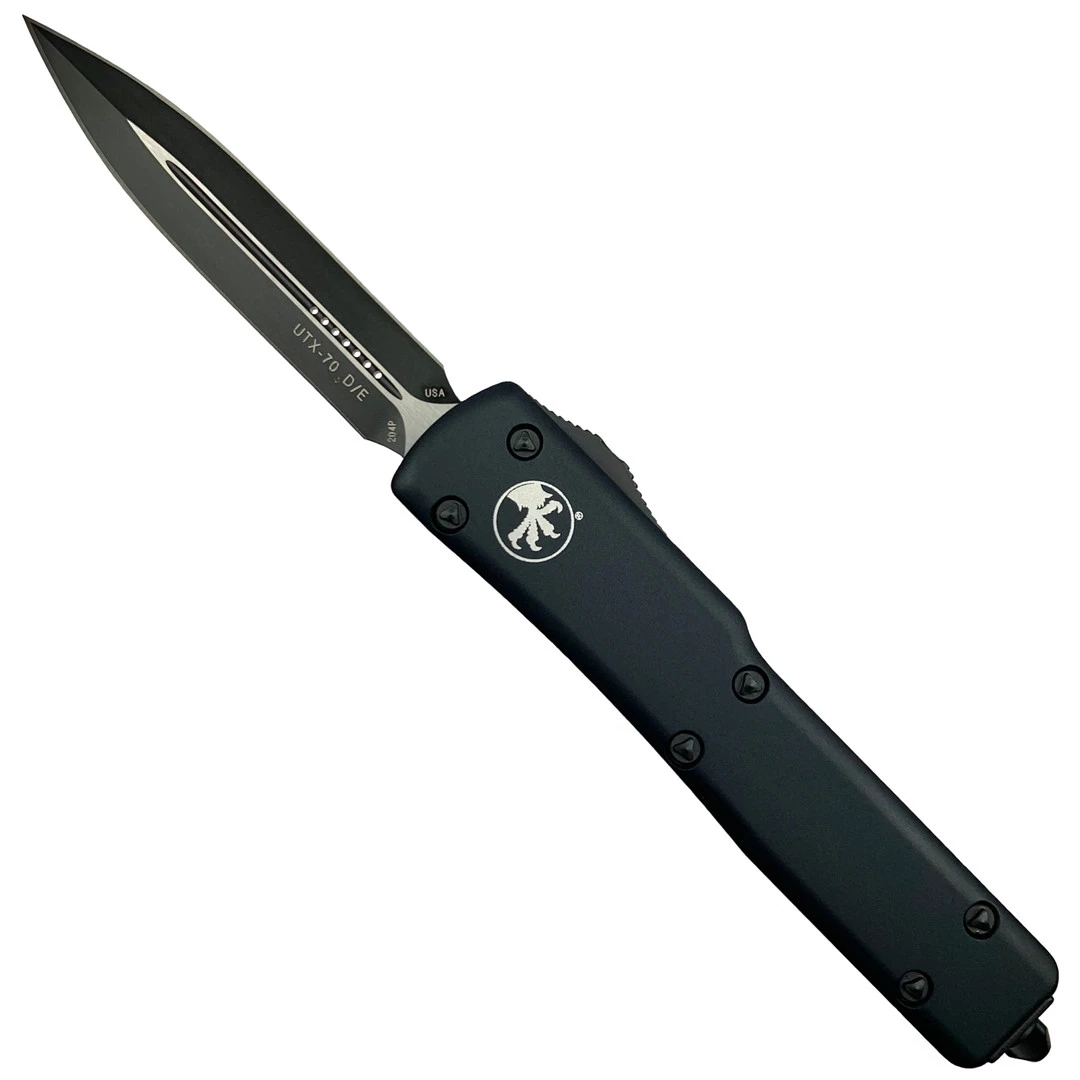 This out-the-front knife features a black anodized handle, all-black hardware and a dagger style blade in a black and satin finish.