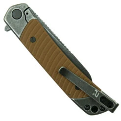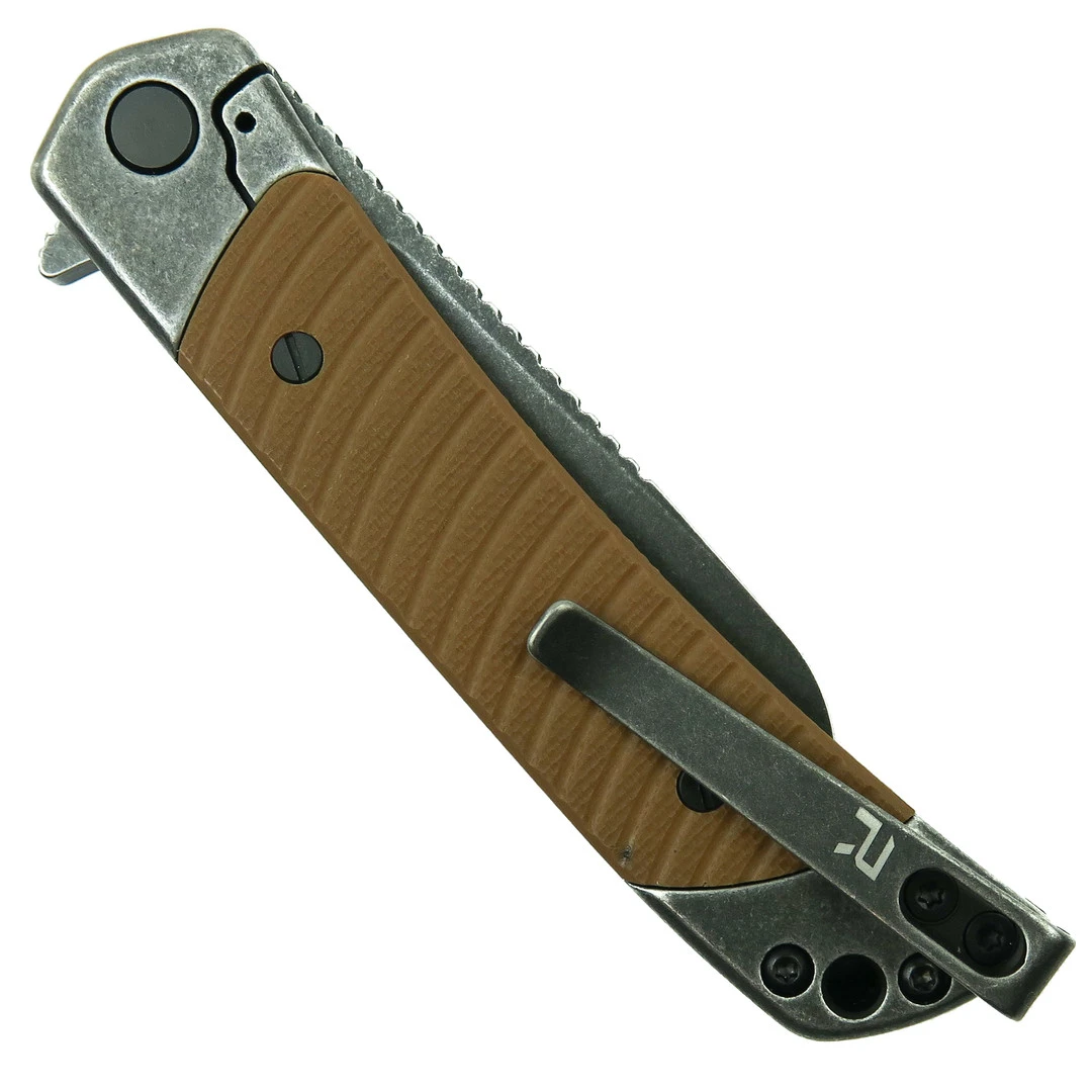 The REVO Duo Brown Sheepsfoot Frame Lock Knife is a handy, lightweight knife. The rescue hook/seatbelt cutter with a slotted drive gives this knife double the abilities while retaining the traditional knife form. The sheepsfoot style blade of this knife is made of 9Cr18MoV stainless steel with a black stonewash finish. This steel provides durability and excellent corrosion resistance. The milled G10 handle scales are comfortable, providing a solid grip. This knife boasts a sleek black backspacer. The main blade opens smoothly with a flipper tab, while the rescue hook tool opens by nail nick. This capable knife is a fantastic everyday carry.