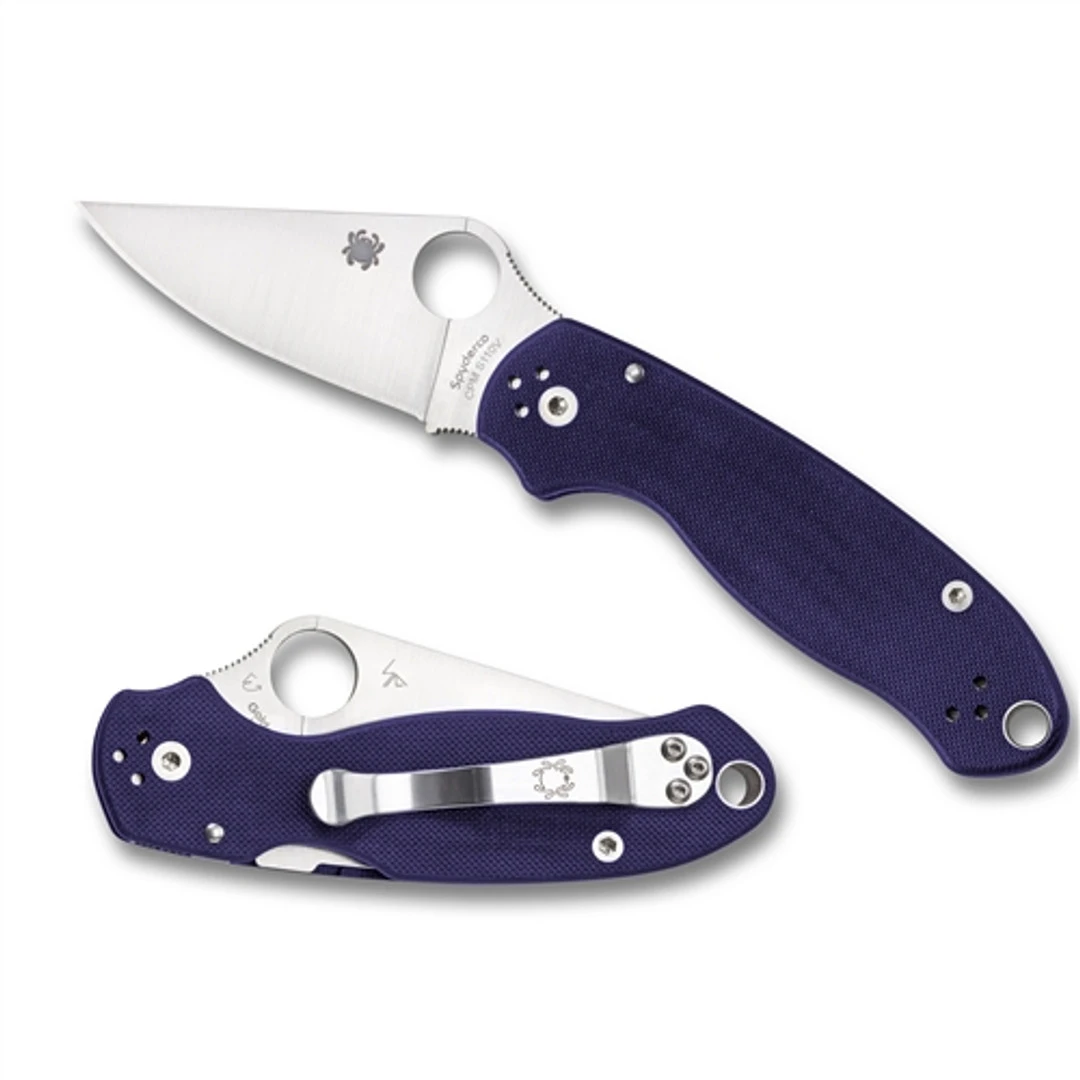 The Para 3 folder model was designed through the original concept of the ever-so-popular Spyderco Paramilitary series but never quite made it into production. At last, after much anticipation and suggestions from the beloved family of Spyderco lovers worldwide, the Para 3 is ready to launch into the hands of the consumer. The Paramilitary 2 has been regarded as one of the most popular folder knives ever created and so the Spyderco Para 3 offers the same exceptional performance and reliability but in a more compact and pocket-friendly design. Each model features a premium stainless steel blade that is supported by Spyderco’s patented Compression Lock mechanism–allowing users to safely close the blade with one hand without ever having the operating hand come near the cutting edge. Much like the design of Paramilitary 2, it still features a slightly flared handle base as well as the integrated jimping which provides increased control with any cutting job. This upgraded model, the C223GPDBL, features a dark blue G-10 handle, a satin finished clip point style blade, Spyderco’s trademark round hole opening feature and an ambidextrous 4-way positional pocket clip which allows for a tip up or tip down carry option on either side of the handle. Made in the USA.