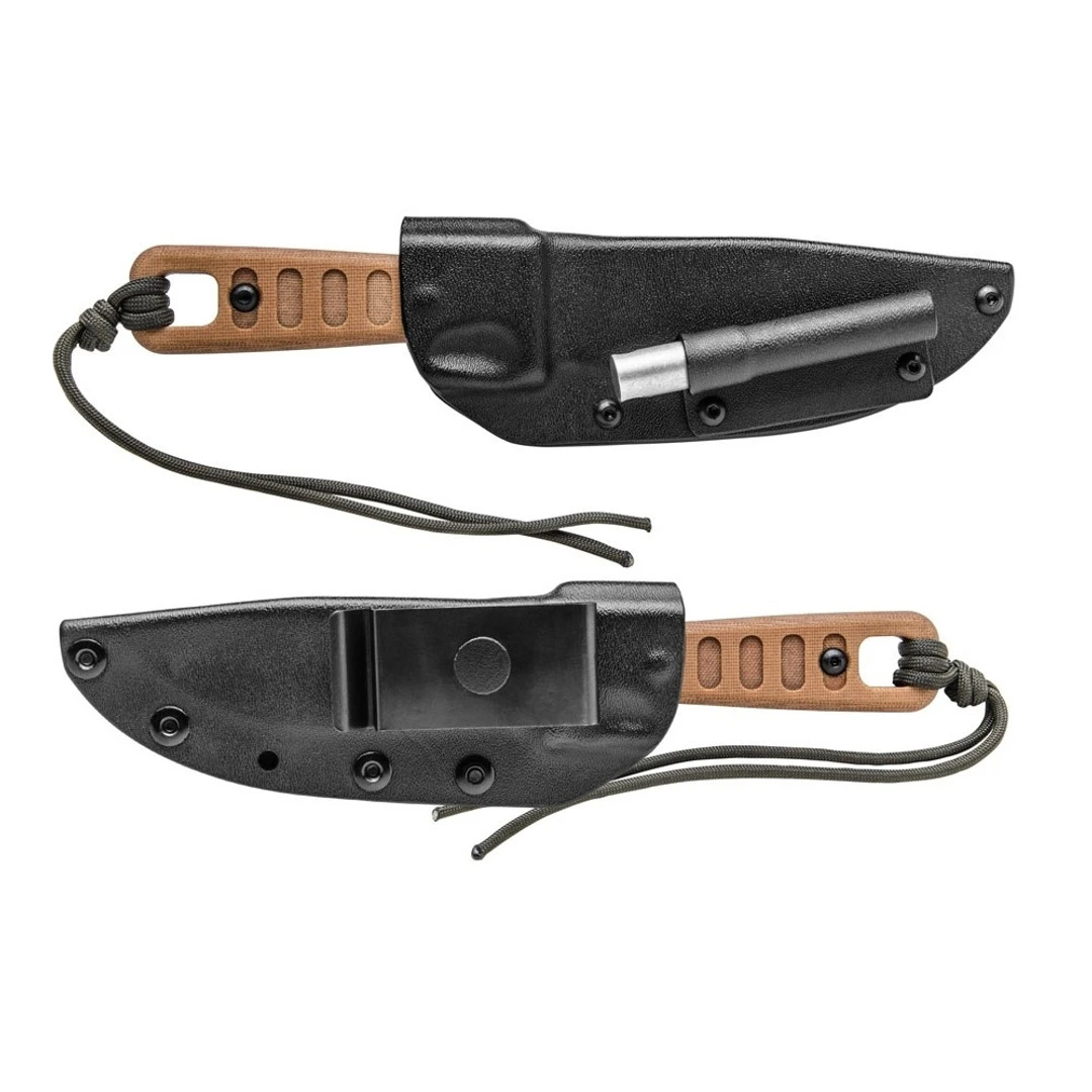 The TOPS Lite Trekker is the culmination of several months of designing and refining–but the end-result was completely worth the wait. Each full-tang designed model has several well thought out features such as a positive grip, high-visibility squares set into the handle design as well as a think blade that reduces the overall weight without sacrificing function performance. This model features tan linen micarta handles, a hunter’s point style blade in a black traction coating and the black kydex sheath boasts a rotating spring steel clip. Made in the USA.