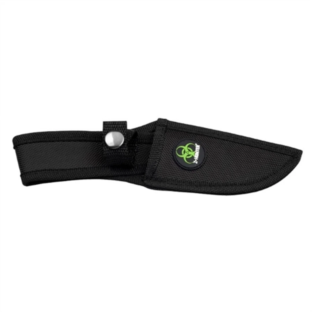 Whether you are preparing for the zombie apocalypse or just have a great eye for style-the entire Z-Hunter line of knives and tools has you covered. Each fixed blade comes stand with a full tang design and the the nature of the blade increases cutting strength by up to 25%. This model features a black G-10 handle, a partially serrated clip point style blade in a two-toned black and green finish and the black nylon sheath includes a button-clasp security strap and offers a belt carry option.